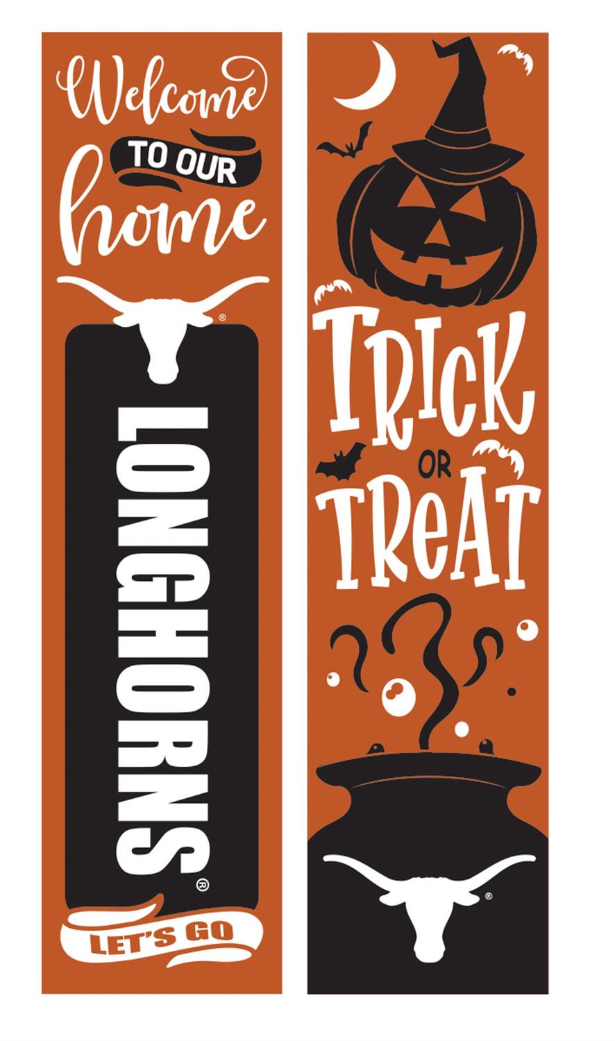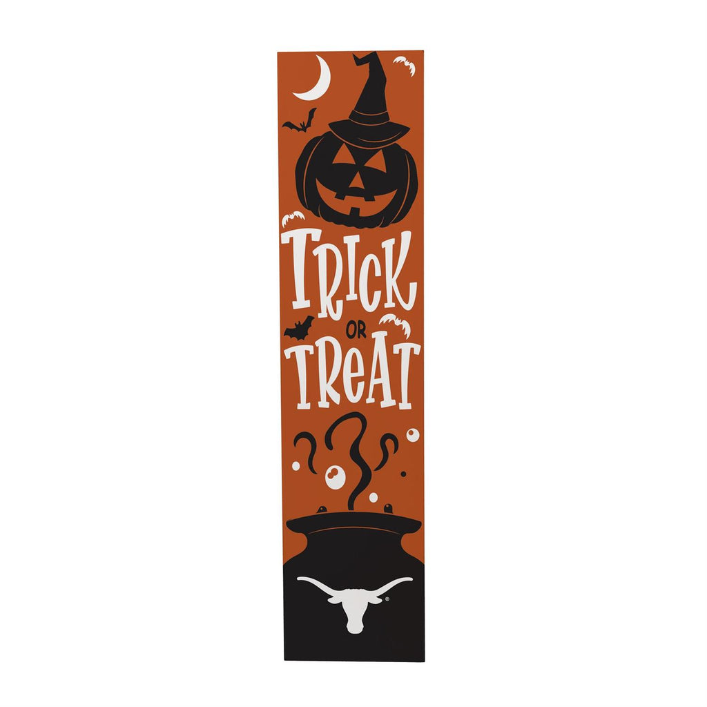 Celebrate Halloween with a touch of Texas pride using this 46-inch double-sided porch leaner. Perfect for displaying your love for the University of Texas, this leaner features a festive design with classic Halloween imagery like a pumpkin and witch's hat. The sturdy construction ensures it withstands the season's elements, while its vibrant colors add a lively touch to your porch decor. Easily switch sides for a different look, making it versatile for any occasion. Enhance your Halloween decorations with this unique blend of school spirit and spooky fun.