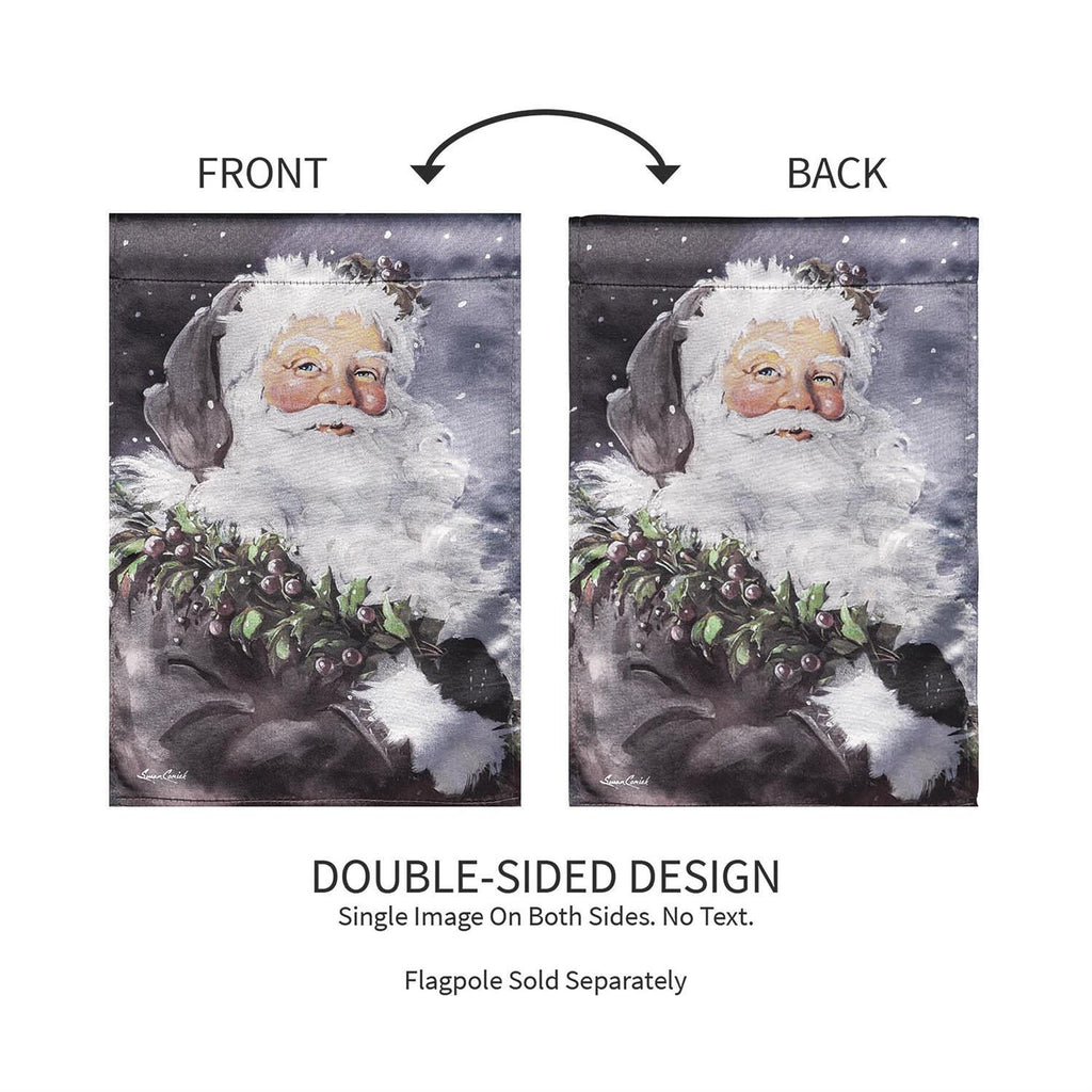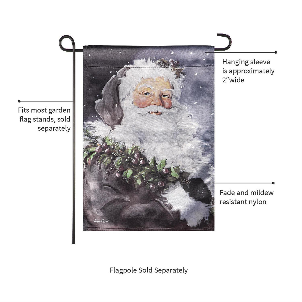 Decorate for the season and welcome friends and family to the home with this lustre garden flag. It Santa Claus against a dark, snowy background. A welcoming “Merry Christmas” message greets family and friends. Made of premium satin polyester fabric, Evergreen’s Lustre flags have the highest sheen on the market. The UV-protected dyes are locked in by our heat-transferring process that guarantees artwork is protected from the elements season after season. Our sun-blocking technology is used on these two-sided designs to reduce fading and fraying, ensuring that they stay vibrant for years to come.