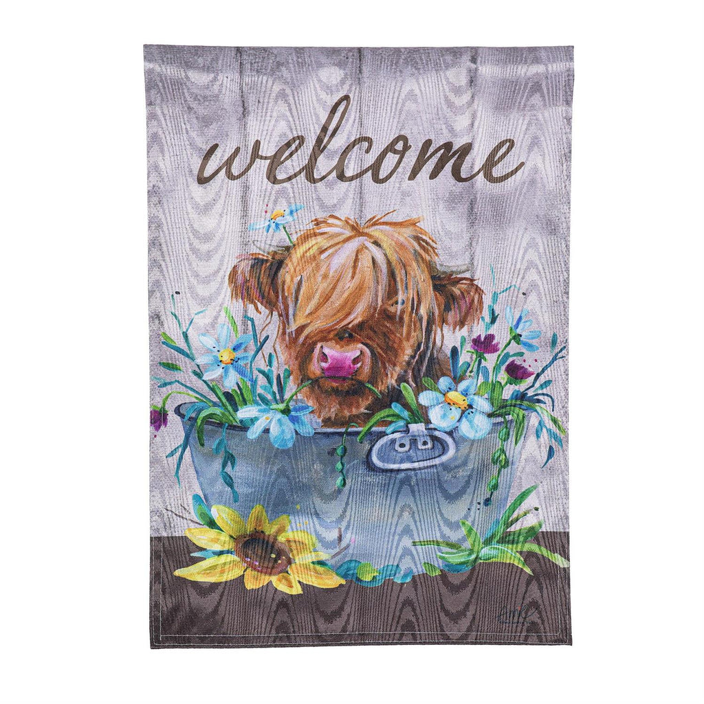 Create a warm welcome at home with this charming moire flag. It features an adorable highland cow surrounded by flowers that's perfect for the season and beyond. These double-sided Moire flags deliver unmatched shimmer with a beautiful woodgrain effect that's readable on both sides and illuminates in sunlight. Enjoy all-weather features with heat transferred artwork, UV protected dyes, and sun-blocking material that offer brilliant color and non-fray durability. This flag features fabric made from recycled plastic; it will contribute to Evergreen’s efforts to save over 75 million plastic bottles from landfills each year (assumes an 18.6 oz. bottle). It's both beautiful and eco-friendly!