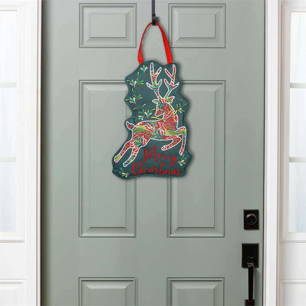 Add festive cheer to your entryway with this Patterned Reindeer Door Décor. Measuring 13.5 inches in length, 1.25 inches in width, and 19 inches in height, this delightful piece features a beautifully detailed reindeer with vibrant holiday patterns. Perfect for the Christmas season, it’s designed to bring a joyful touch to your home. The sturdy construction ensures it will last through the season, while the attached loop makes it easy to hang on any door. Welcome guests with a warm 'Merry Christmas' greeting and enhance your holiday ambiance with this charming addition.