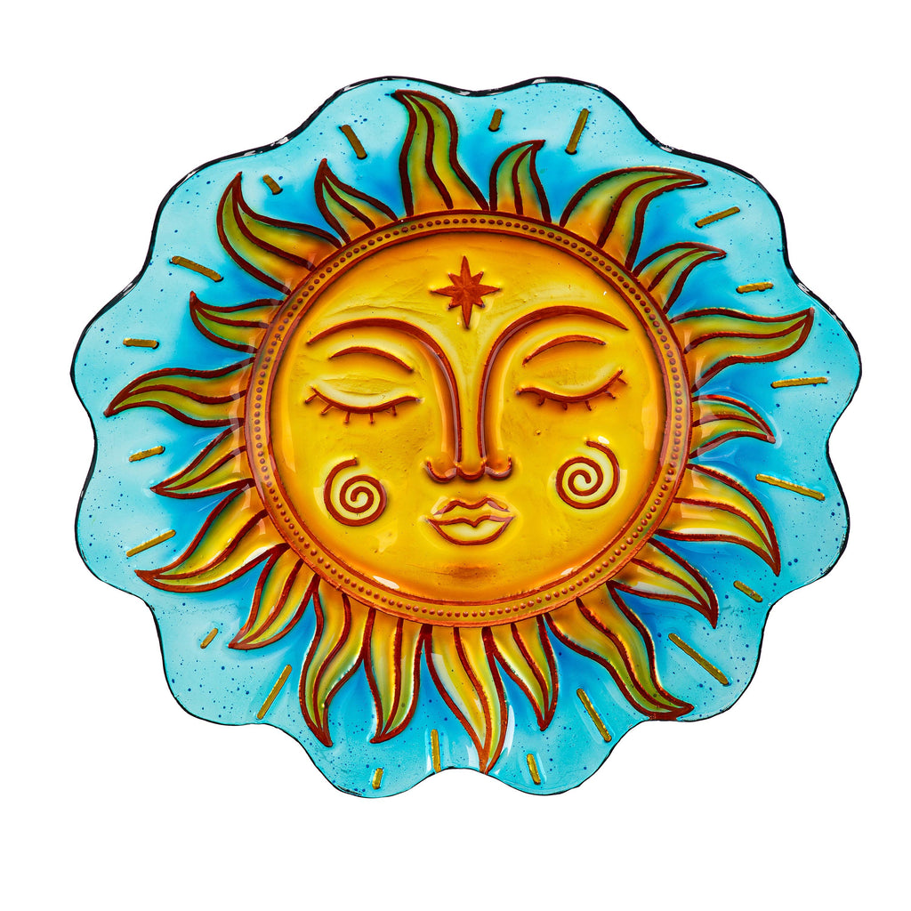 The Garden of Wonder Birdbath in Glass Celestial Harmony features a stunning sun design, perfect for adding a touch of celestial beauty to your outdoor space.