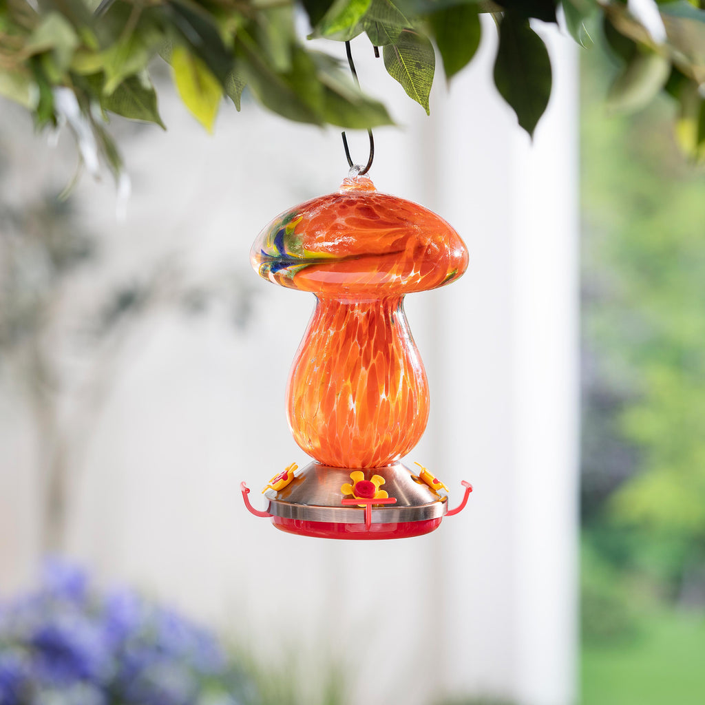 Art Glass Hanging Mushroom Hummingbird Feeder, Orange