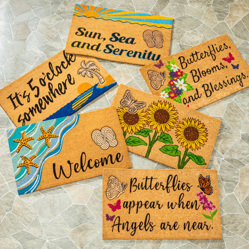 The 'Beach Vibes Only' coir mat brings a touch of coastal charm to your doorstep with its whimsical rubber embossed flip flops design.
