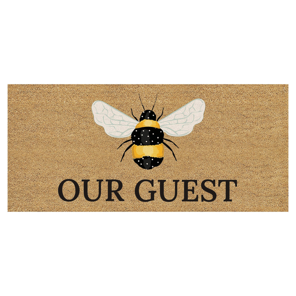 Welcome your visitors with the charming Bee Our Guest Flocked Coir Sassafras Switch Mat, featuring a delightful bee design. Perfect for enhancing any entryway with a touch of whimsy.