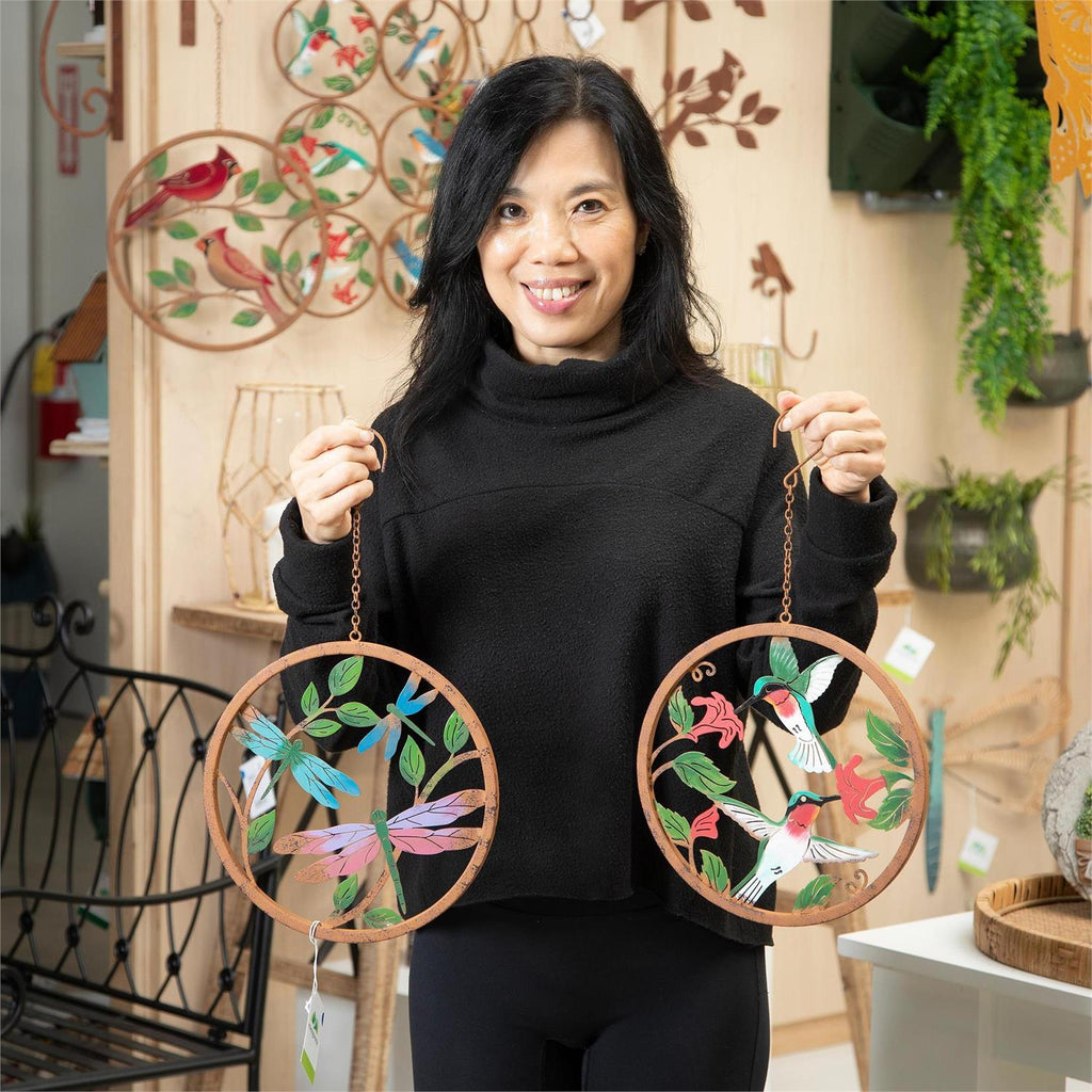 Enhance your garden with this set of Rustic Friends Hand Painted Outdoor Hanging Décor, featuring vibrant designs of hummingbirds and dragonflies. Each piece measures 10 inches in diameter and is crafted with intricate detailing to celebrate the charm of pollinators. Perfect for adding a splash of color to your outdoor space, these hangings are easy to install with included hooks. The durable construction ensures they withstand various weather conditions, making them an ideal year-round addition to your garden or patio. Enjoy the beauty of nature with this charming décor set.