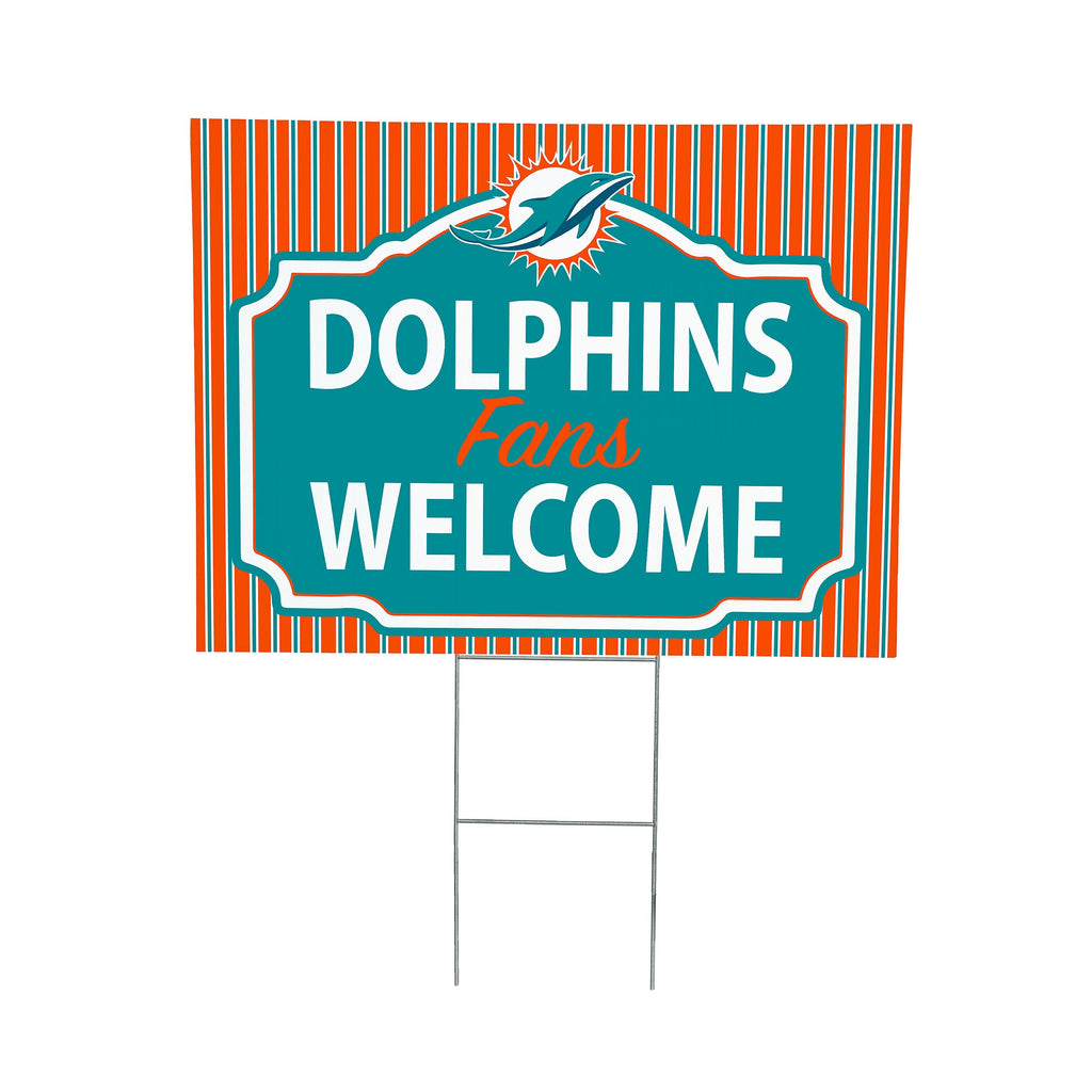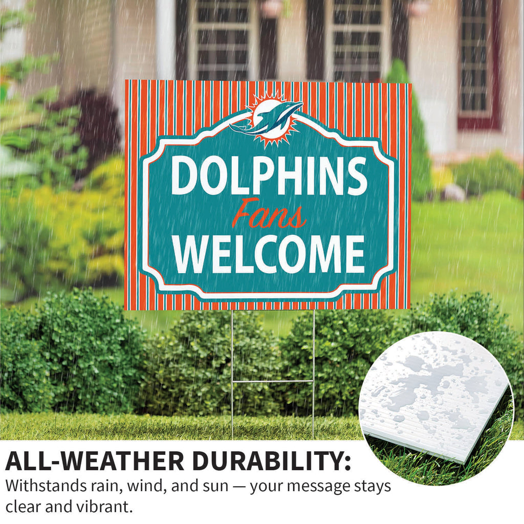 Welcome guests to your home with this vibrant Miami Dolphins yard sign, showcasing team pride in the garden.