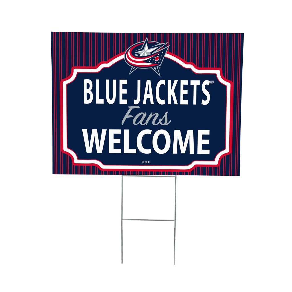- Features a bold design with Columbus Blue Jackets logo and 'Fans Welcome' message.