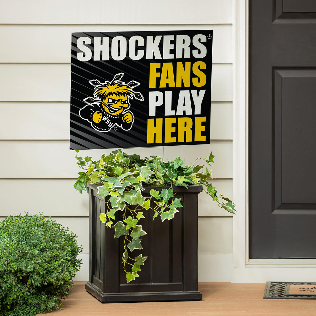 Show your team pride with the Wichita State University Yard Sign 'Fans Play Here', an ideal addition to your garden decor. Perfect for displaying your support for the Shockers with bold colors and a spirited design.