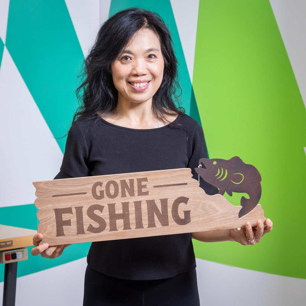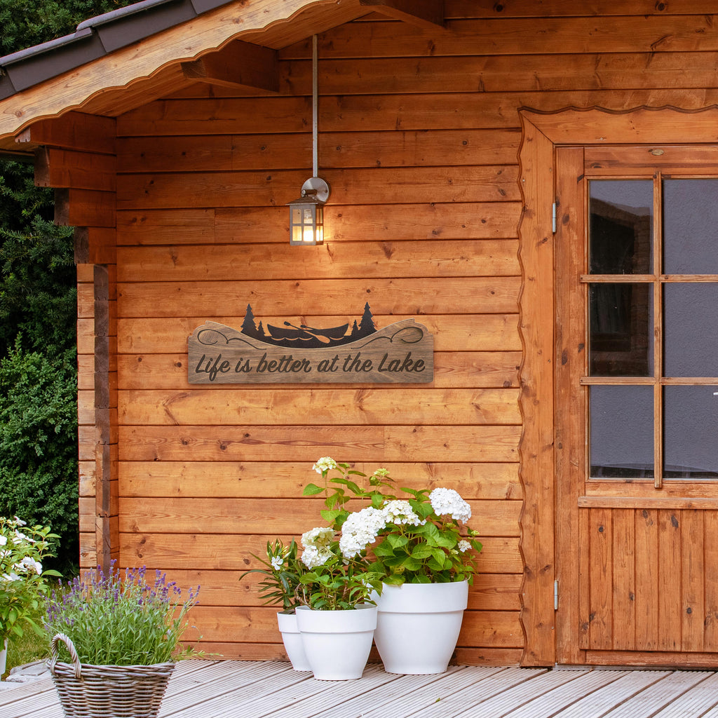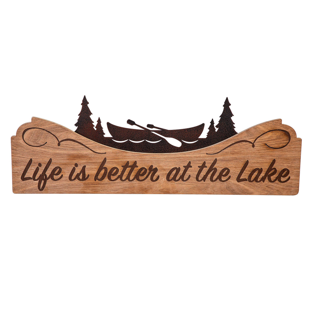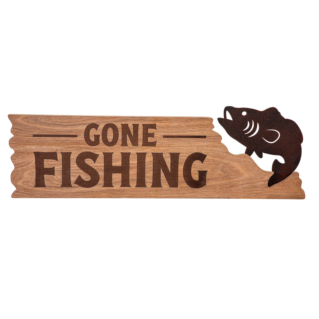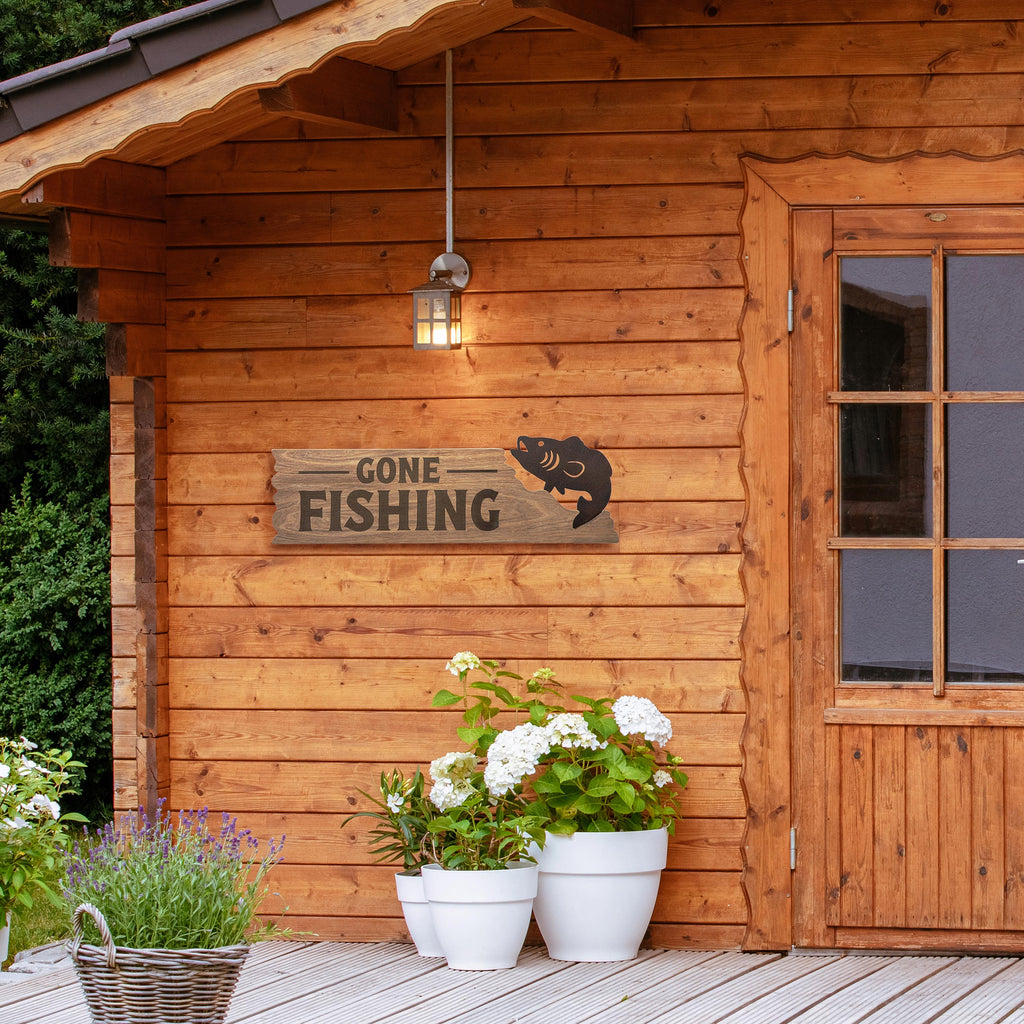 Enhance your cabin charm with this rustic wood and metal 'Gone Fishing' sign, perfect for lake and lodge settings.