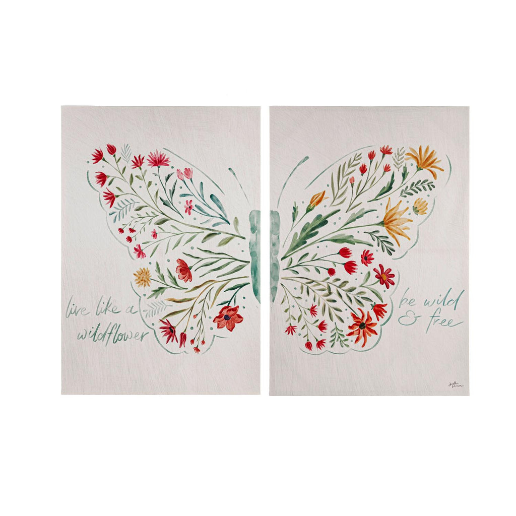 Transform your living space with the 'Life Like a Wildflower & Be Wild & Free' wall décor set. This stunning pair features a beautiful butterfly design crafted from vibrant wildflower patterns. Measuring 24x36 inches each, they offer an expansive visual appeal, perfect for adding a touch of nature-inspired tranquility to any room. The uplifting phrases 'Live Like a Wildflower' and 'Be Wild & Free' infuse positivity and a sense of freedom. Ideal for bedrooms, living rooms, or any space that needs a refreshing, artistic touch.