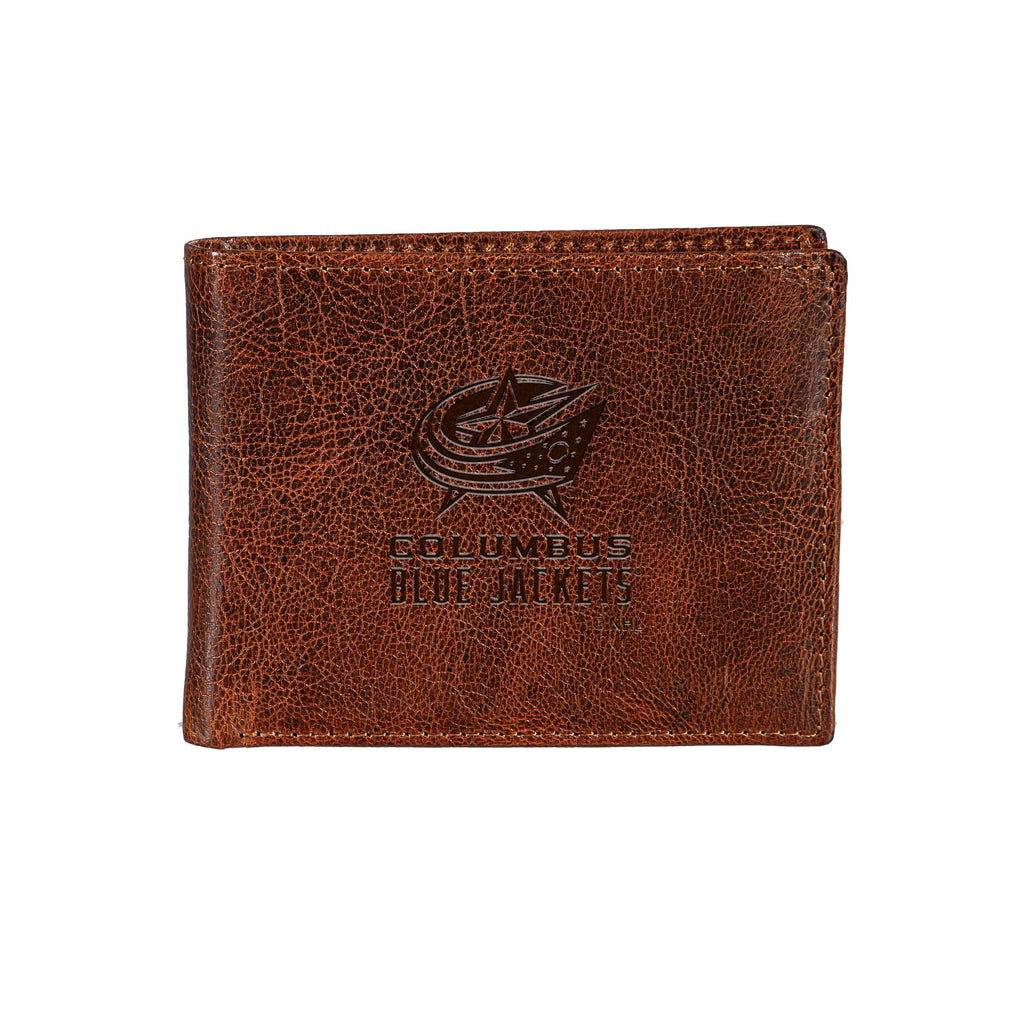 Columbus Blue Jackets, Embossed 100% Genuine Tumbled Leather Passcase Bi-Fold Wallet, Brown