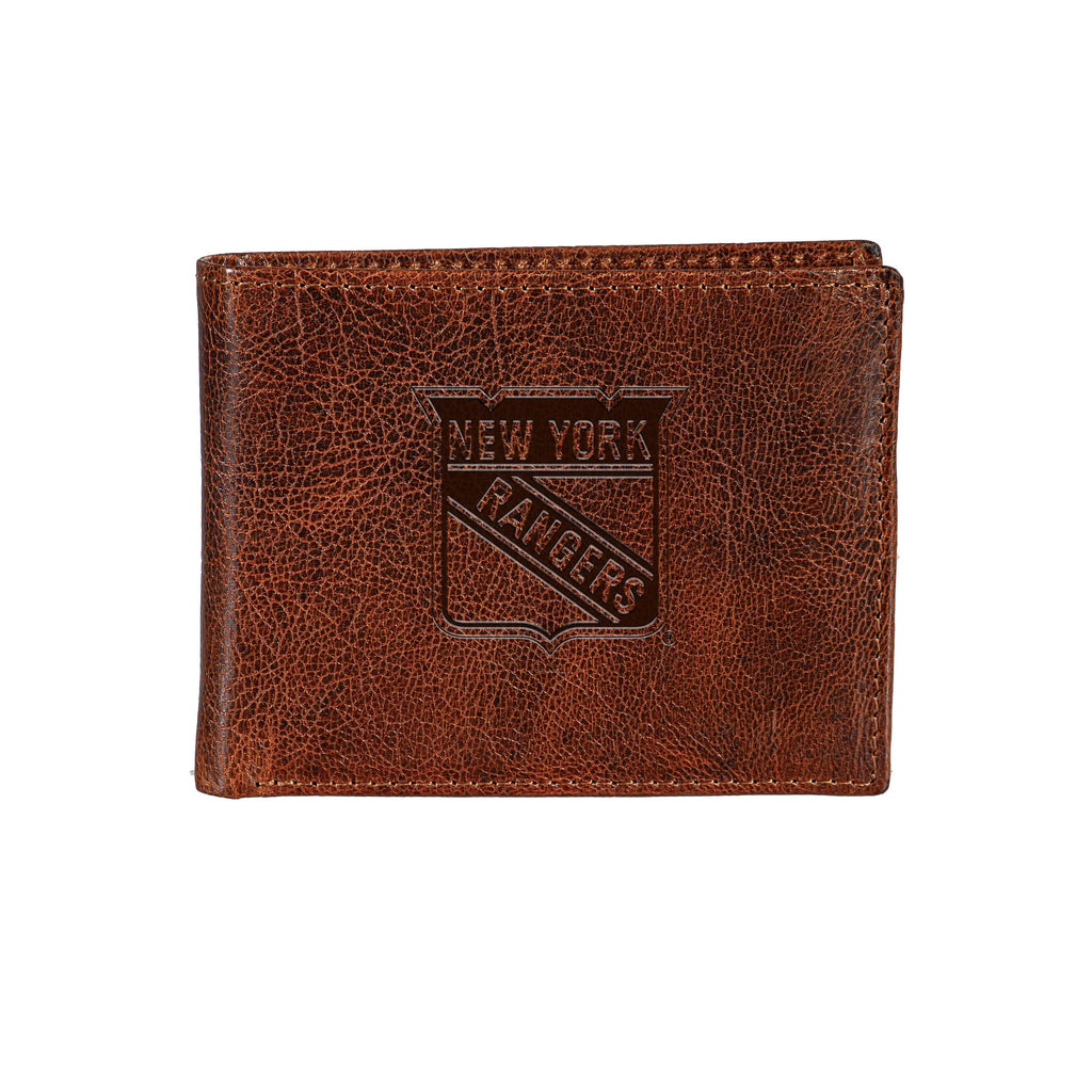 Carry your essentials in style with this New York Rangers embossed bi-fold wallet, crafted from 100% genuine tumbled leather. Its sleek design offers both functionality and a nod to your favorite NHL team.
