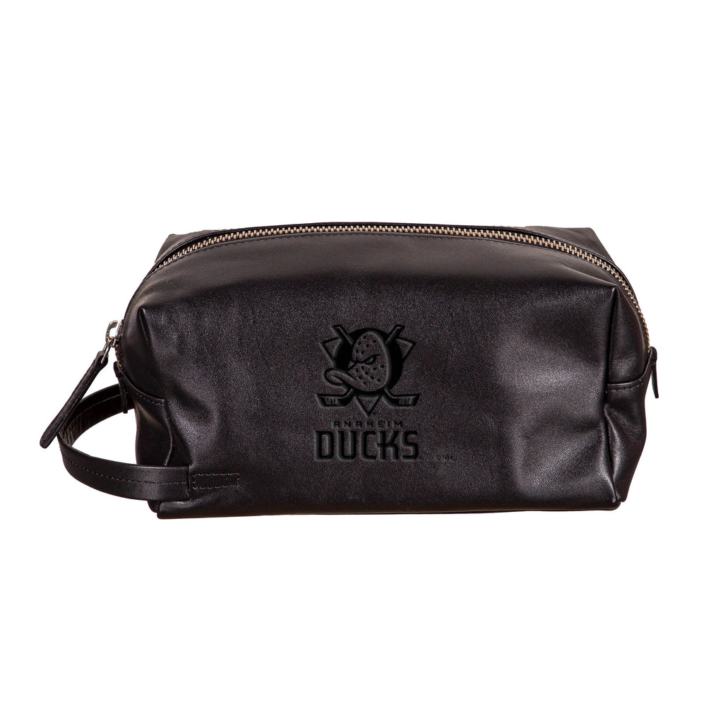 This embossed toiletry bag is perfect for Anaheim Ducks fans, offering a stylish way to organize essentials while traveling. Made from durable materials, it features a sleek black design with ample storage space.