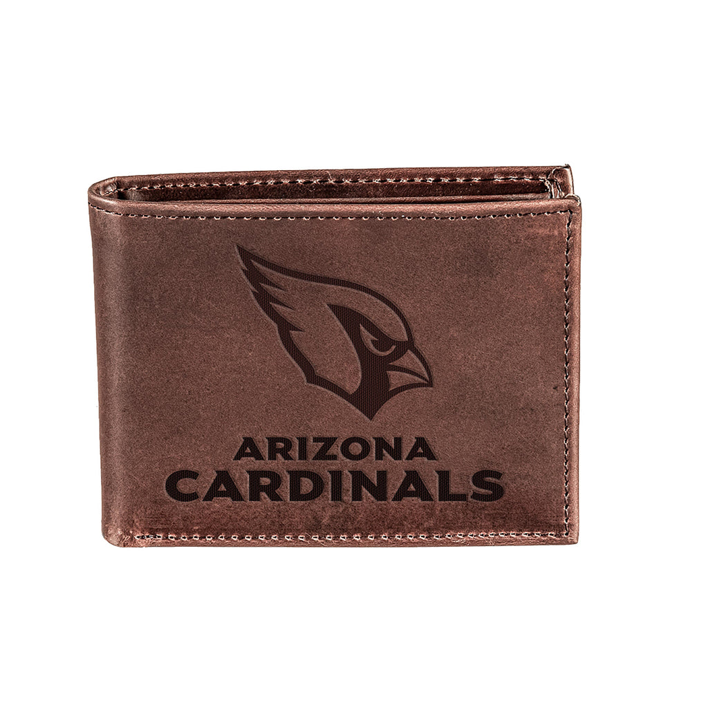 This Arizona Cardinals bi-fold wallet is crafted from 100% genuine leather, offering a sleek and durable option for fans. Its rich brown color and team logo make it a stylish accessory for any supporter.