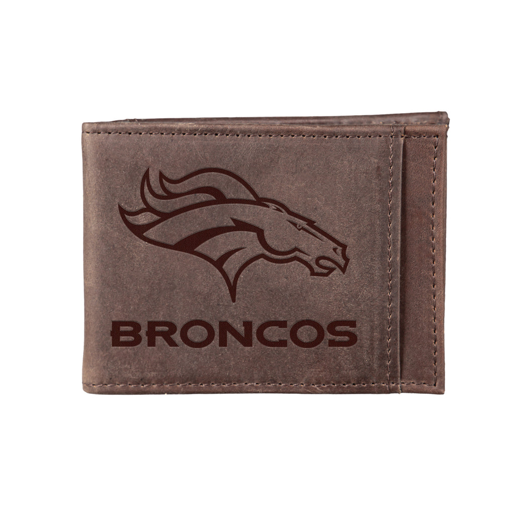 This Denver Broncos front pocket wallet combines functionality with team pride, featuring RFID blocking technology and a sleek brown design.
