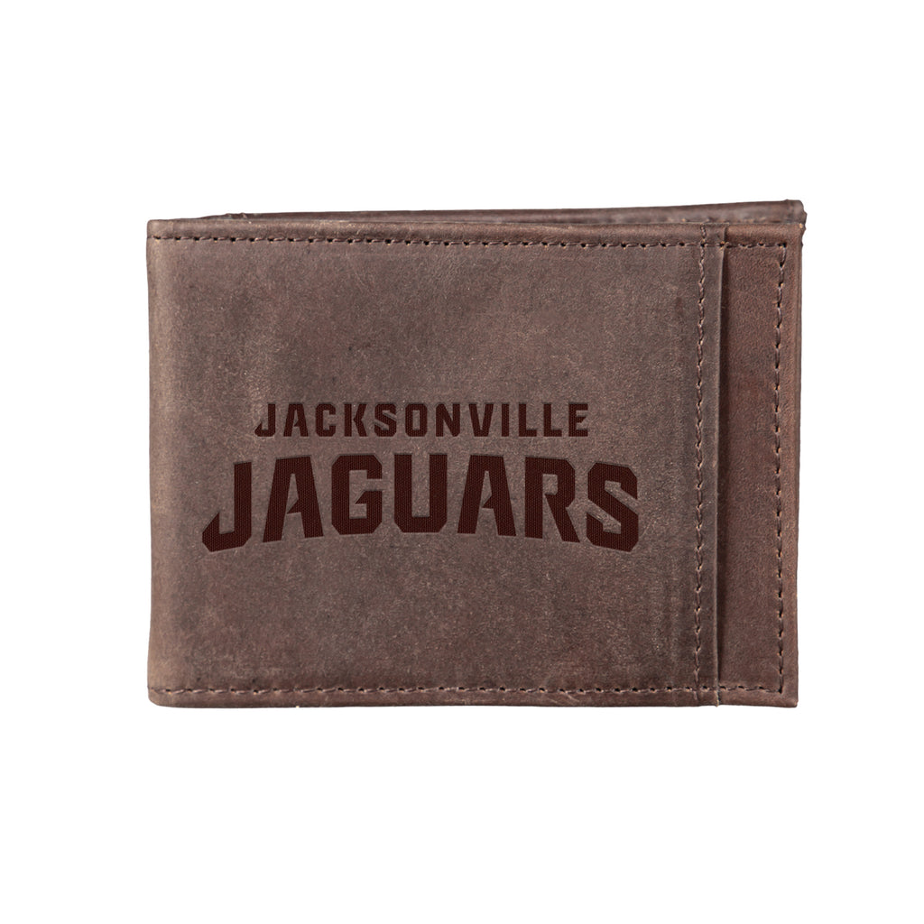 This stylish brown front pocket wallet features the Jacksonville Jaguars' logo and offers RFID blocking for added security.