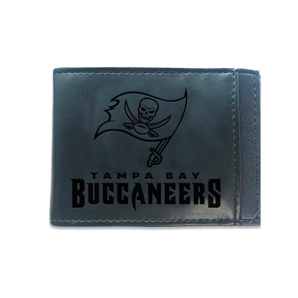 This sleek black front pocket wallet features RFID blocking technology and proudly displays Tampa Bay Buccaneers branding, making it both a stylish and secure accessory for fans.