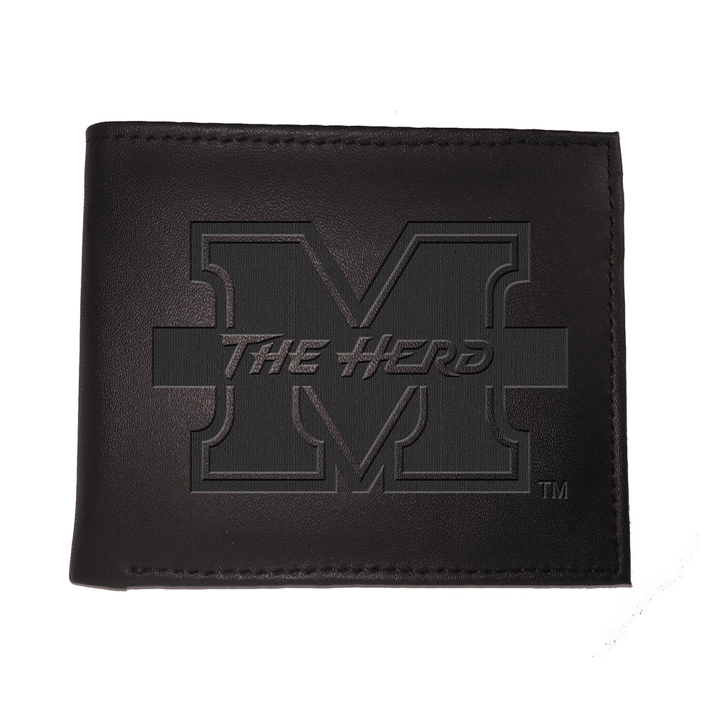 Show your school pride with this sleek Marshall University bi-fold wallet. Crafted from high-quality black leather, it features the university's emblem embossed on the front.