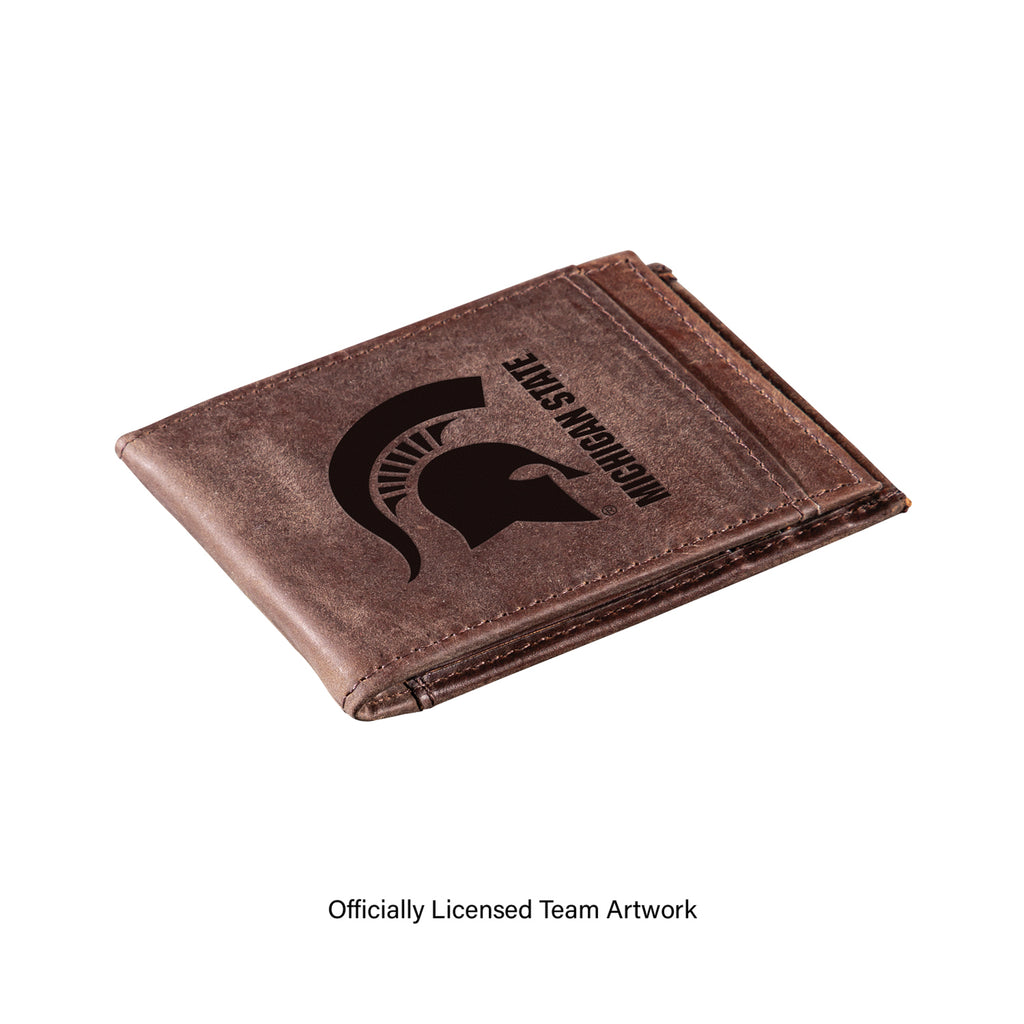 This brown front pocket wallet features RFID blocking technology and is officially licensed by Michigan State University. Its compact size makes it a stylish and practical accessory for fans.