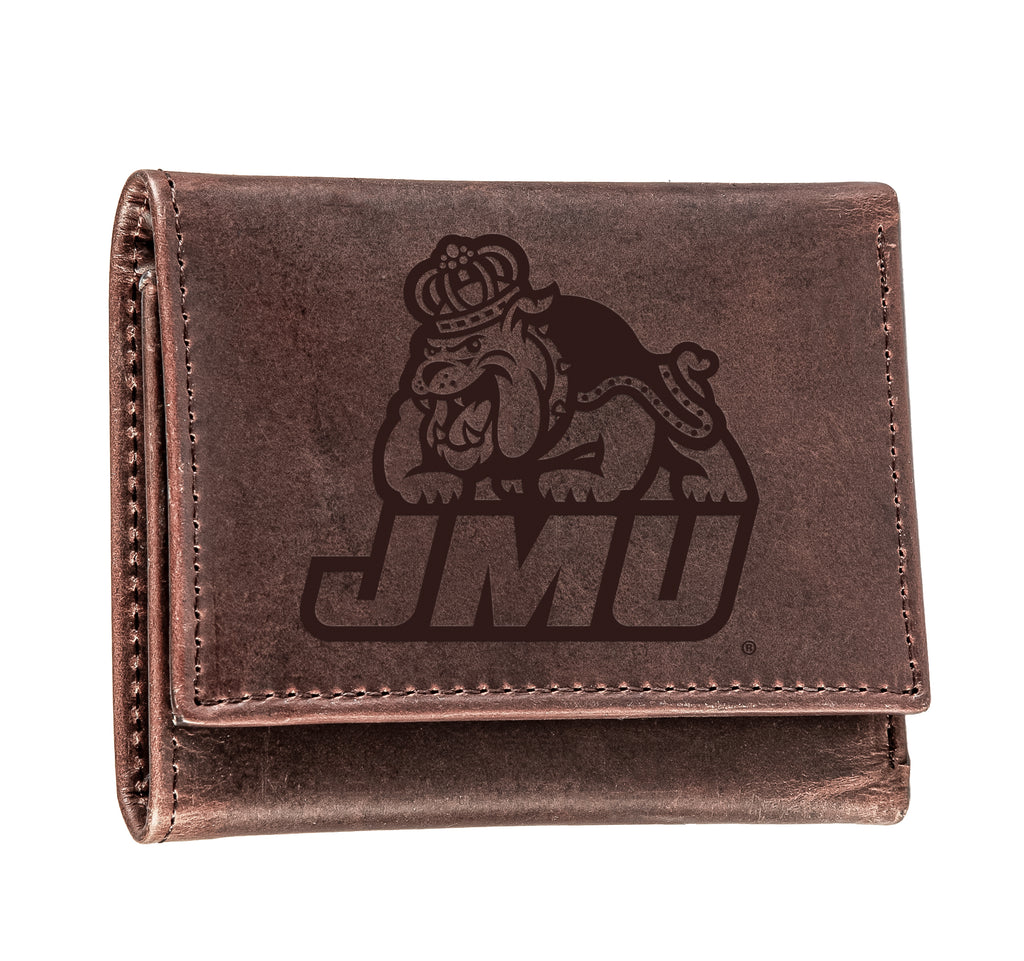 Show off your school spirit with this James Madison University tri-fold wallet, crafted from 100% genuine leather. Its compact design is perfect for keeping your essentials organized.