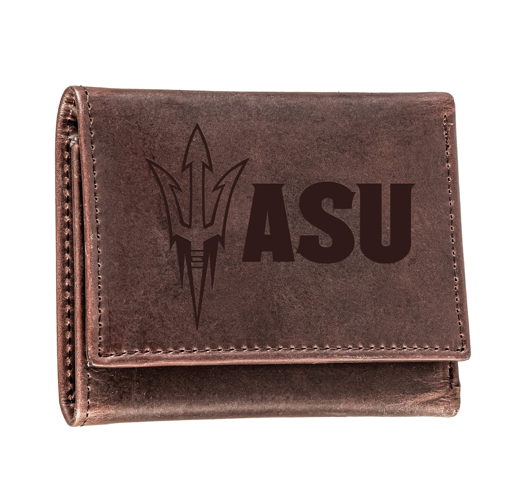 This Arizona State University tri-fold wallet is crafted from 100% genuine leather, providing durability and style for fans. Its compact design is perfect for everyday use.