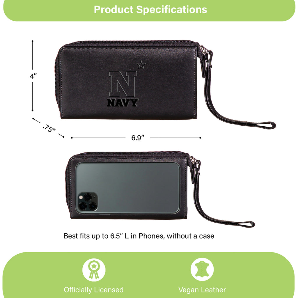 This sleek black wristlet wallet is officially licensed by the US Naval Academy, featuring a compact design perfect for carrying essentials. Made from vegan leather, it combines style with functionality and pride.