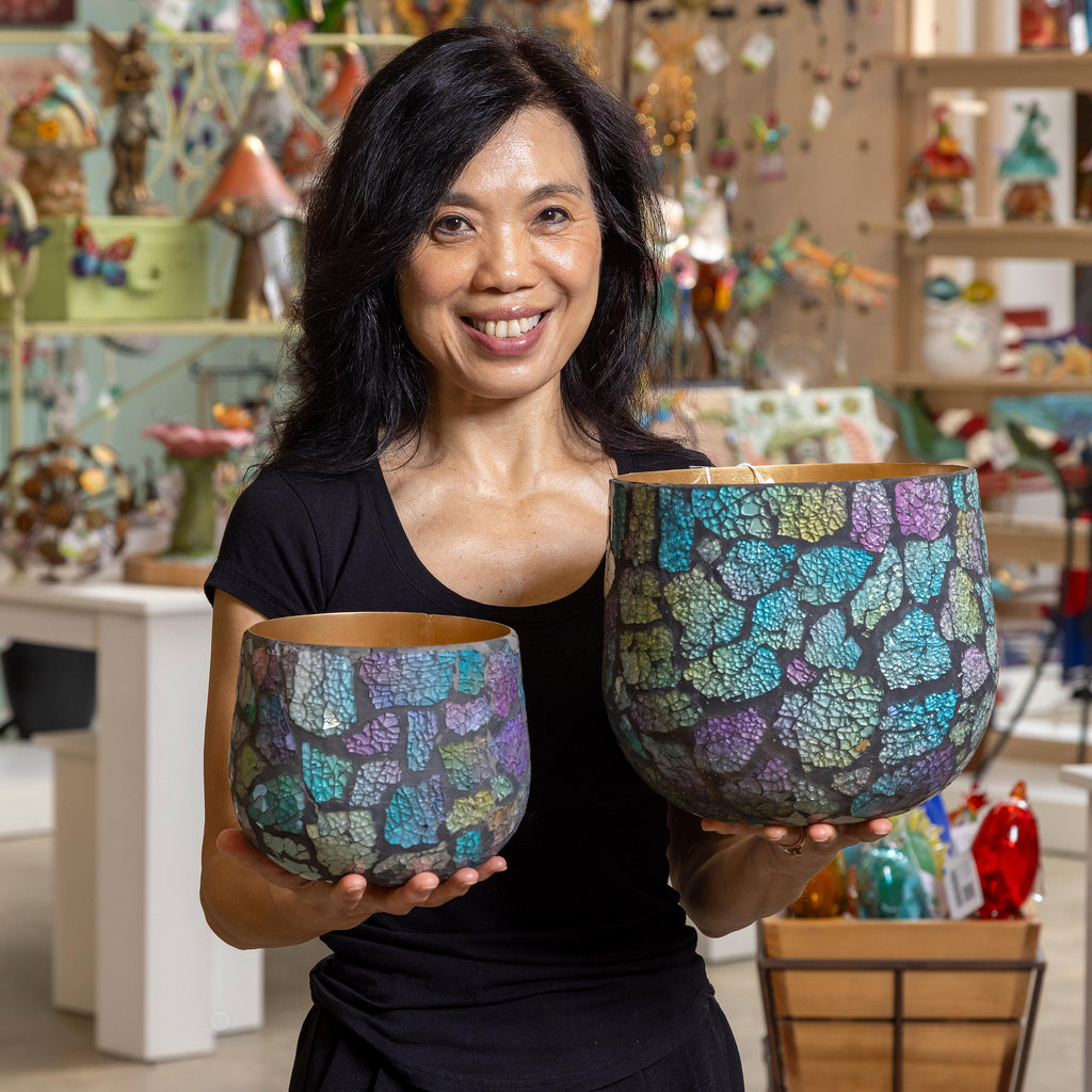 Enhance your living space with the Garden of Wonder Planter set, featuring a stunning mosaic glass design. This nested set of two adds a vibrant and artistic touch to any home decor.