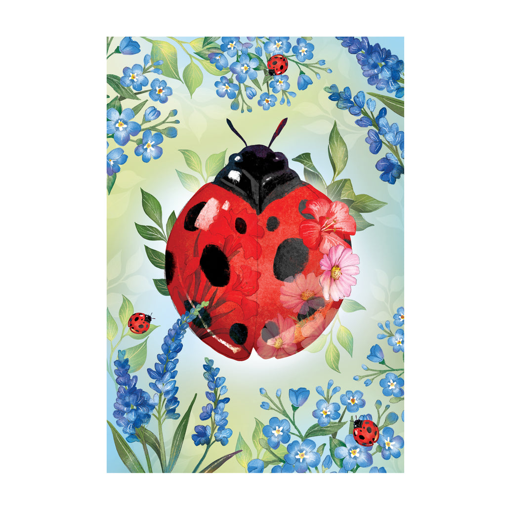 Enhance your outdoor space with the Pollinator Garden Blue Florals Ladybug Applique House Flag, featuring vibrant blues and an adorable ladybug design.