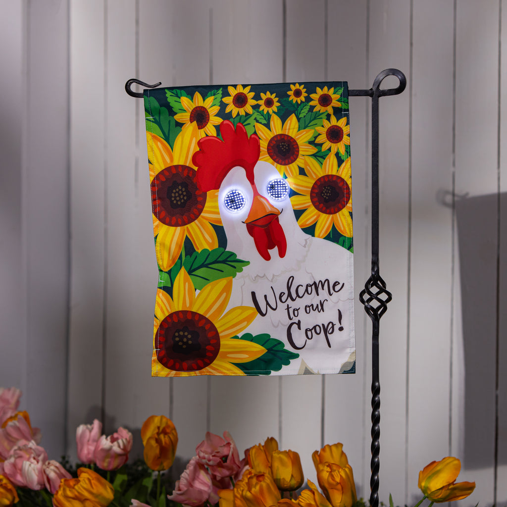Brighten up your garden with the Winky Blinky Welcome To Our Coop Applique Lighted Garden Flag, featuring a cheerful chicken and vibrant sunflowers.