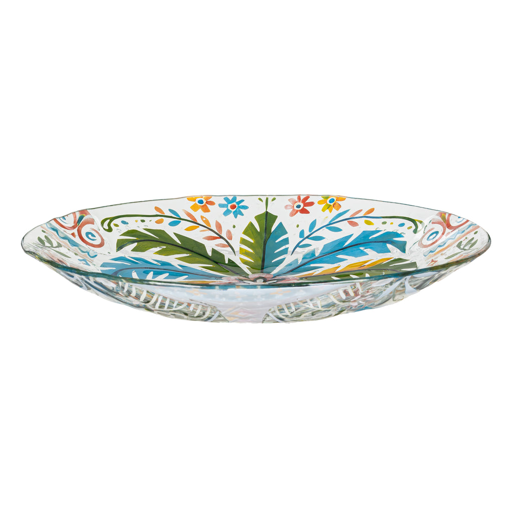 Enhance your garden with the Palm Beach Birdbath, featuring a vibrant palm tree design in colorful folk art style. Crafted from glass, this birdbath adds a splash of tropical flair to any outdoor space.