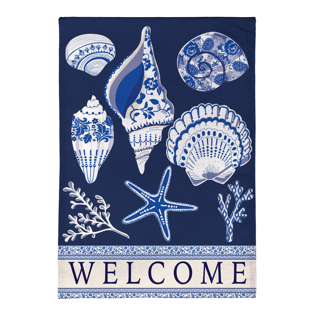 The Chinoiserie Seashells Burlap Garden Flag features an intricate seashell design against a rich blue background, perfect for adding a nautical touch to your outdoor space. Made from durable burlap, this flag is ideal for everyday display in any garden.