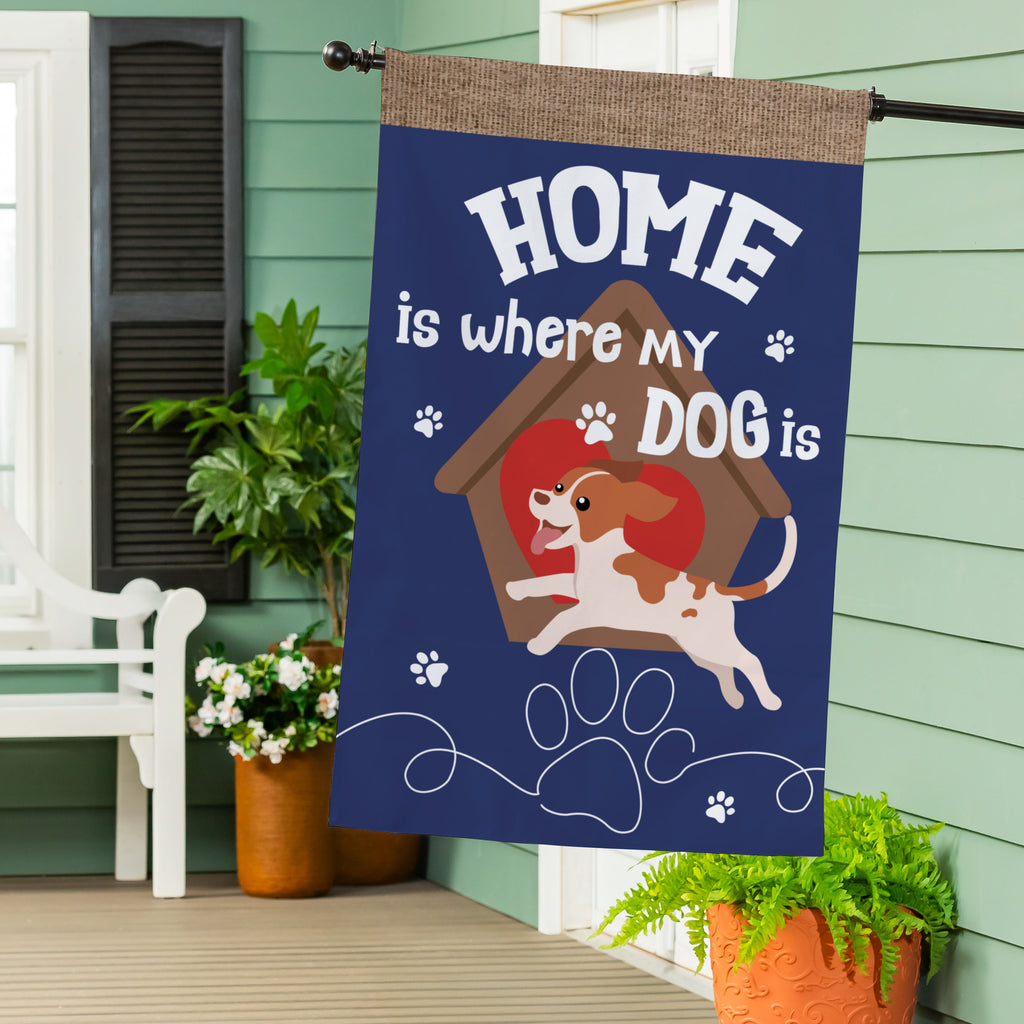 Celebrate your love for your furry friend with the 'Home Is Where My Dog Is' burlap house flag. This charming flag features a playful dog design that's perfect for any dog lover's outdoor decor.