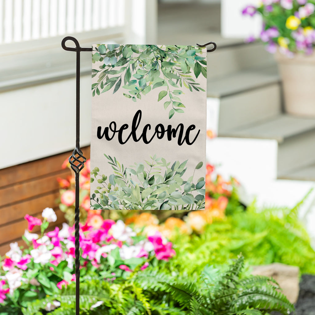 Welcome guests to your home with this charming burlap garden flag, featuring a lush greenery design that's perfect for spring.