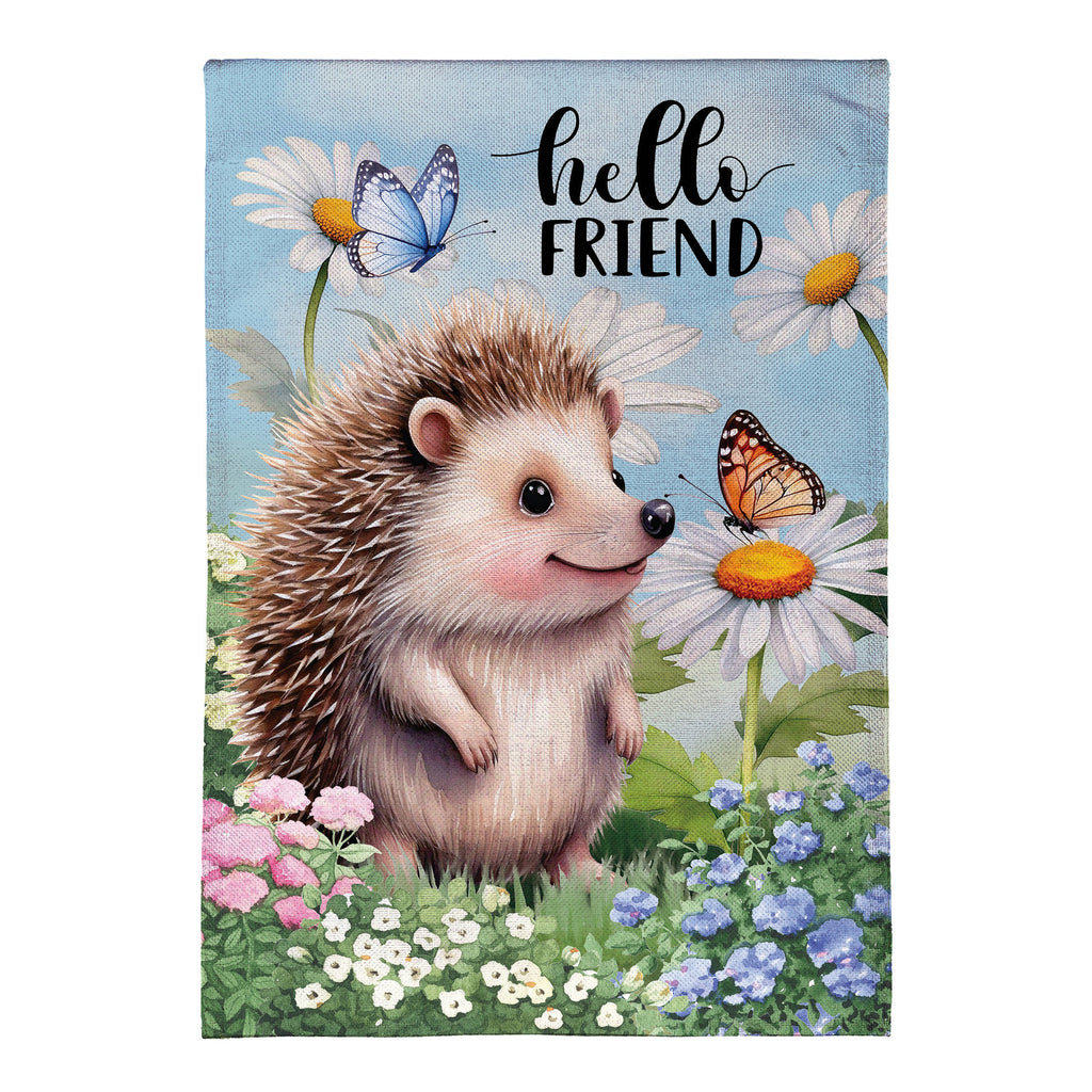 Welcome the spring season with this charming Hedgehog & Daisies Burlap House Flag, perfect for adding a playful touch to your outdoor decor.