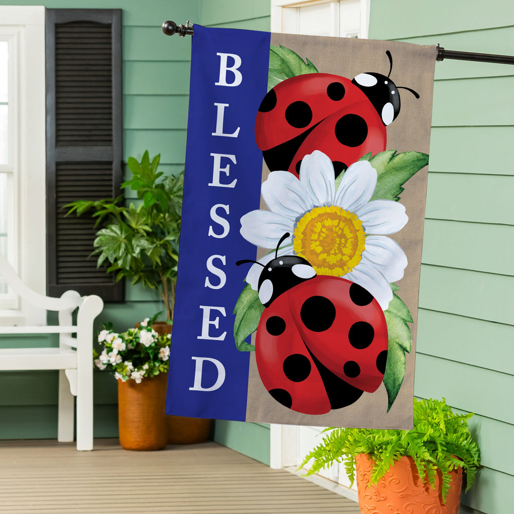 Add a touch of spring to your home with the Welcoming Ladybugs Burlap House Flag. This charming flag features vibrant ladybugs and a daisy, perfect for brightening up any outdoor space.