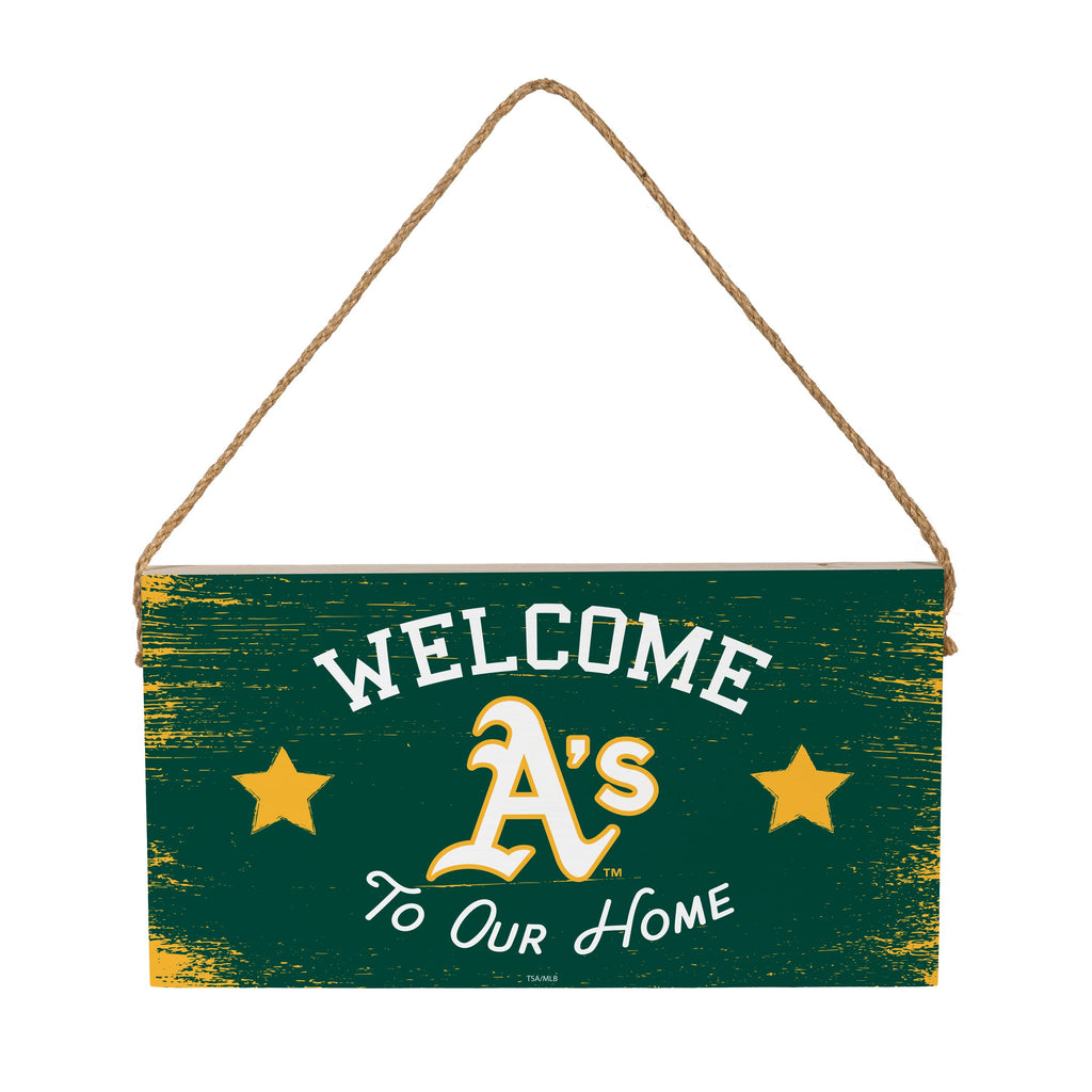 This Athletics wood wall sign adds a spirited touch to your home decor with its vibrant team colors and welcoming message.