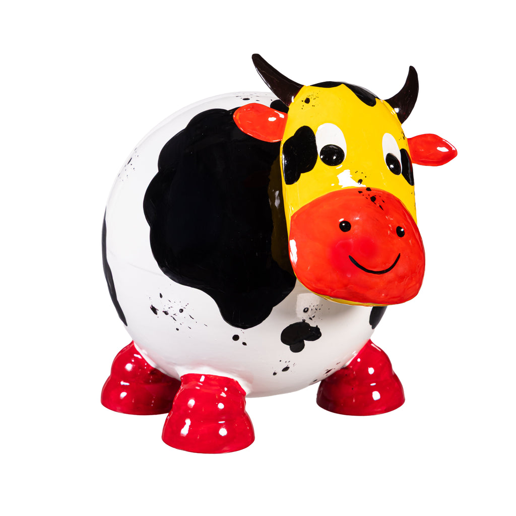Add a whimsical touch to your outdoor space with this Metal Portly Cow Garden Statue, featuring vibrant colors and a charming design.