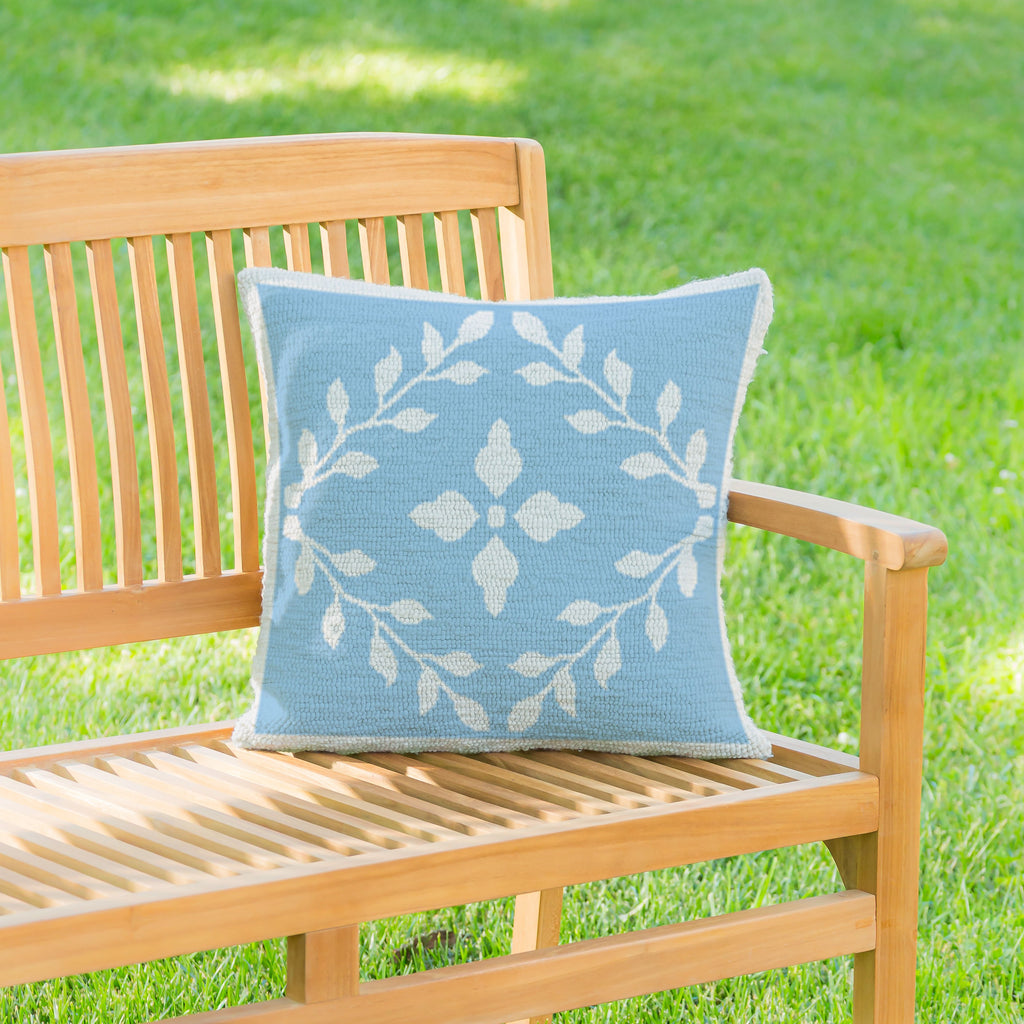 Enhance your outdoor space with this light blue diamonds indoor/outdoor hooked pillow, perfect for adding a touch of summer elegance.