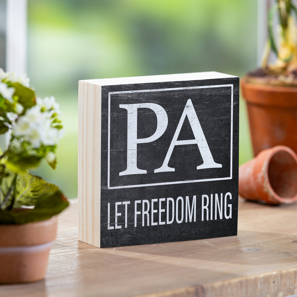 Celebrate your love for Pennsylvania with this stylish wooden block, perfect for adding a touch of state pride to any room. The 'Let Freedom Ring' message adds a patriotic flair to your decor.