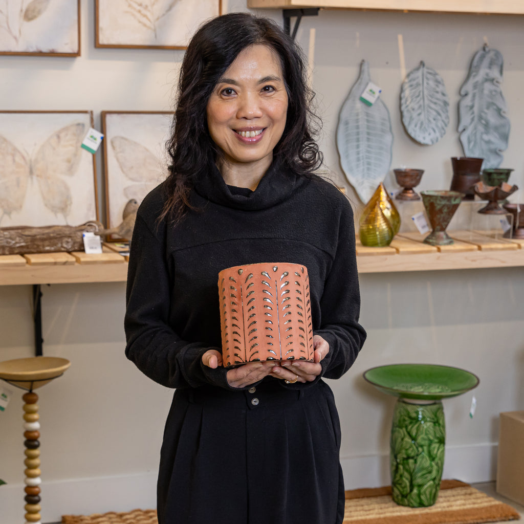 The VivaStyle Planter is a decorative glass planter with a unique cut-out design, perfect for adding a touch of elegance to your spring garden decor. Its compact size makes it ideal for small spaces.