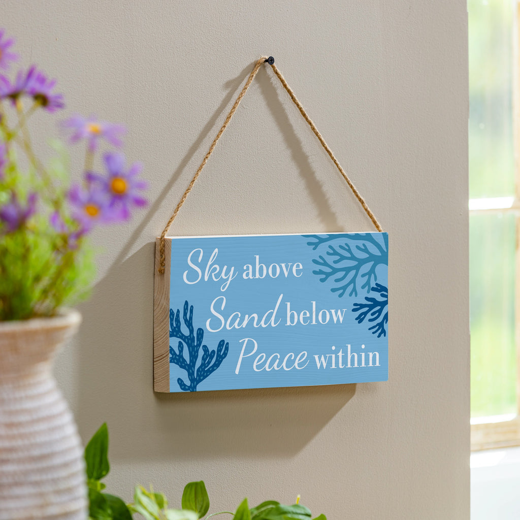 Enhance your home with the Blue Coastal Coral Sea Wood Hanging Sign, featuring an inspiring message and oceanic design. Perfect for adding a touch of summer tranquility to any indoor space.