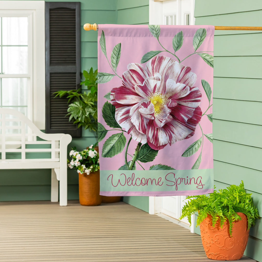 Brighten up your home with this Radiant Pink Flower Suede House Flag, perfect for celebrating the arrival of spring. Made from high-quality suede, this flag features a vivid floral design with a 'Welcome Spring' message.