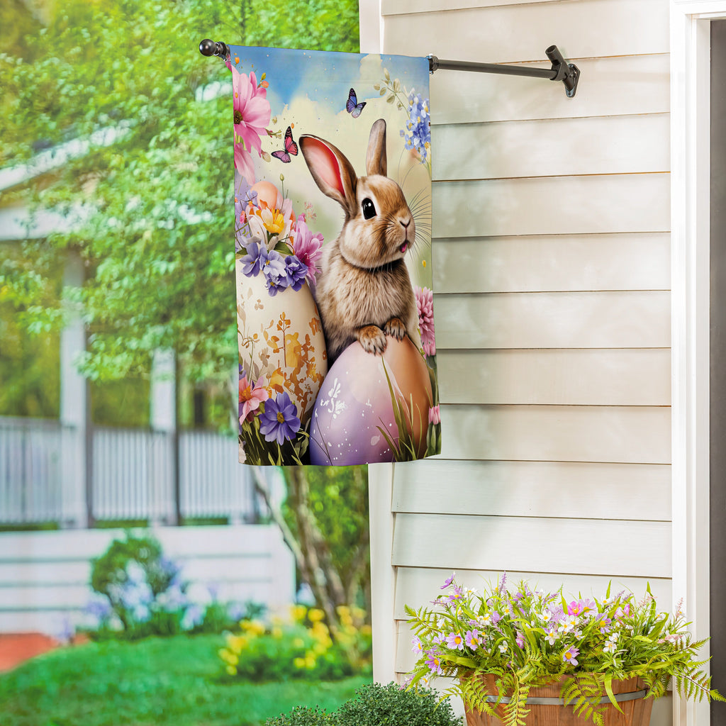Celebrate spring with this charming Bunny & Easter Egg Suede House Flag, featuring a delightful bunny amidst vibrant floral designs and Easter eggs.