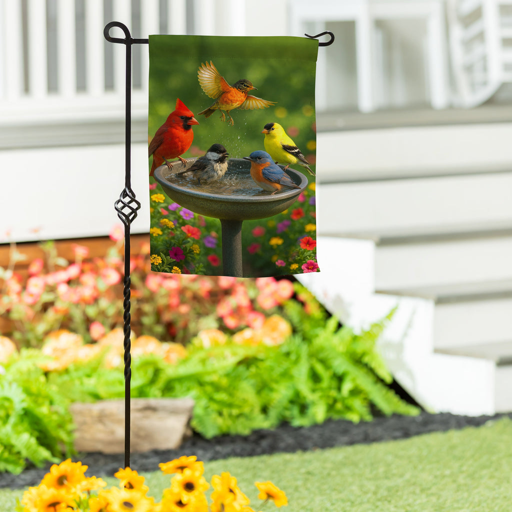 Enhance your garden with the Bathing Birds Suede Garden Flag, featuring vibrant birds gathering at a birdbath, perfect for springtime decor.