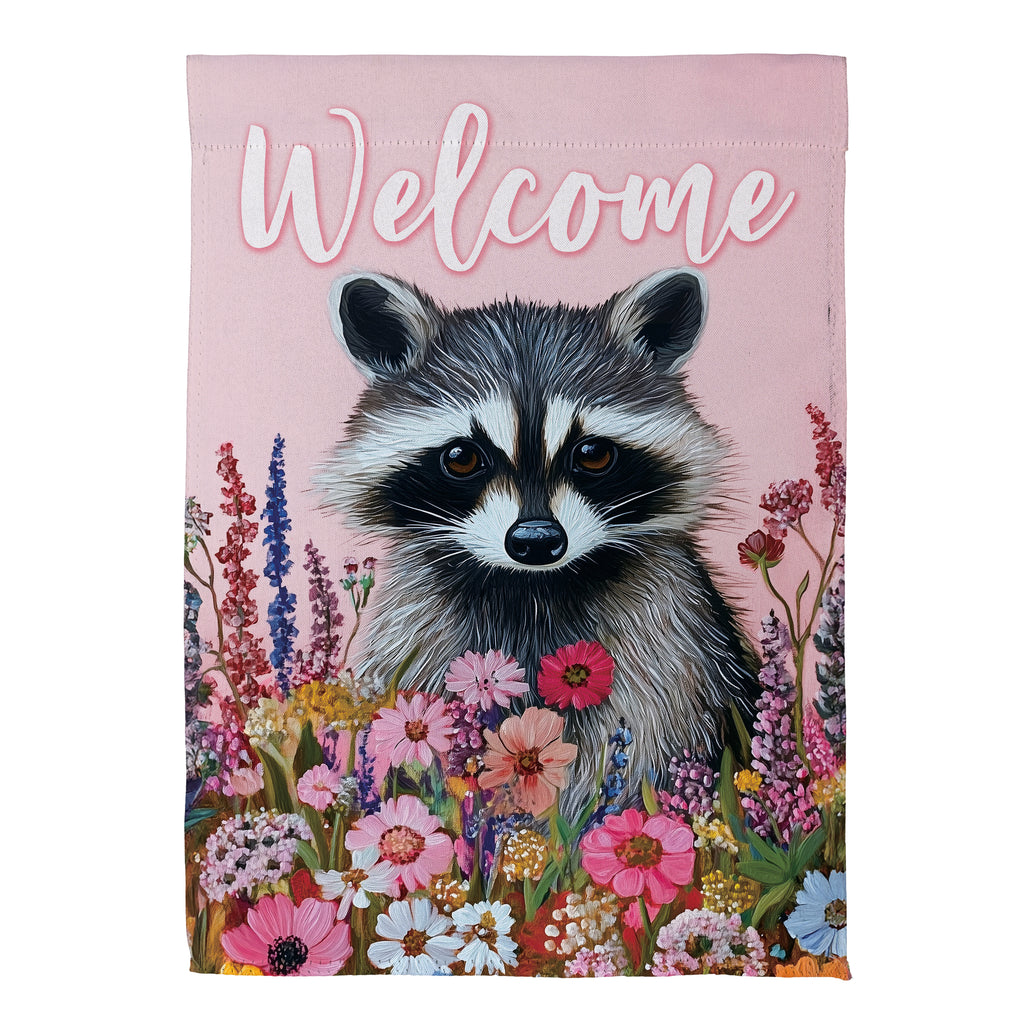 Welcome spring with this charming Floral Racoon Suede House Flag, featuring a cute racoon amidst vibrant blossoms. Perfect for adding a touch of nature and whimsy to your home decor.