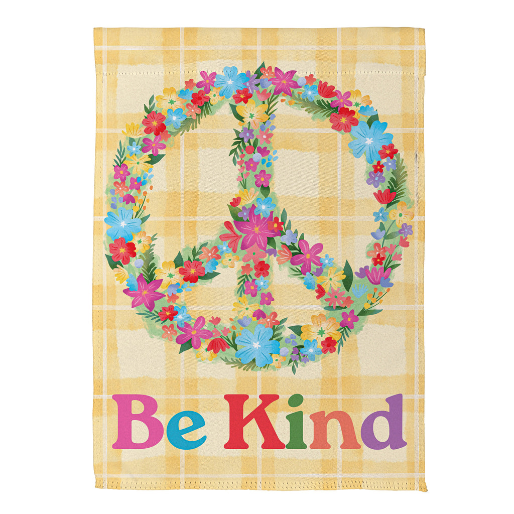 Brighten your garden with the Floral Be Kind Suede Garden Flag, featuring a vibrant floral peace sign and 'Be Kind' message. Perfect for adding a touch of spring to your outdoor space.