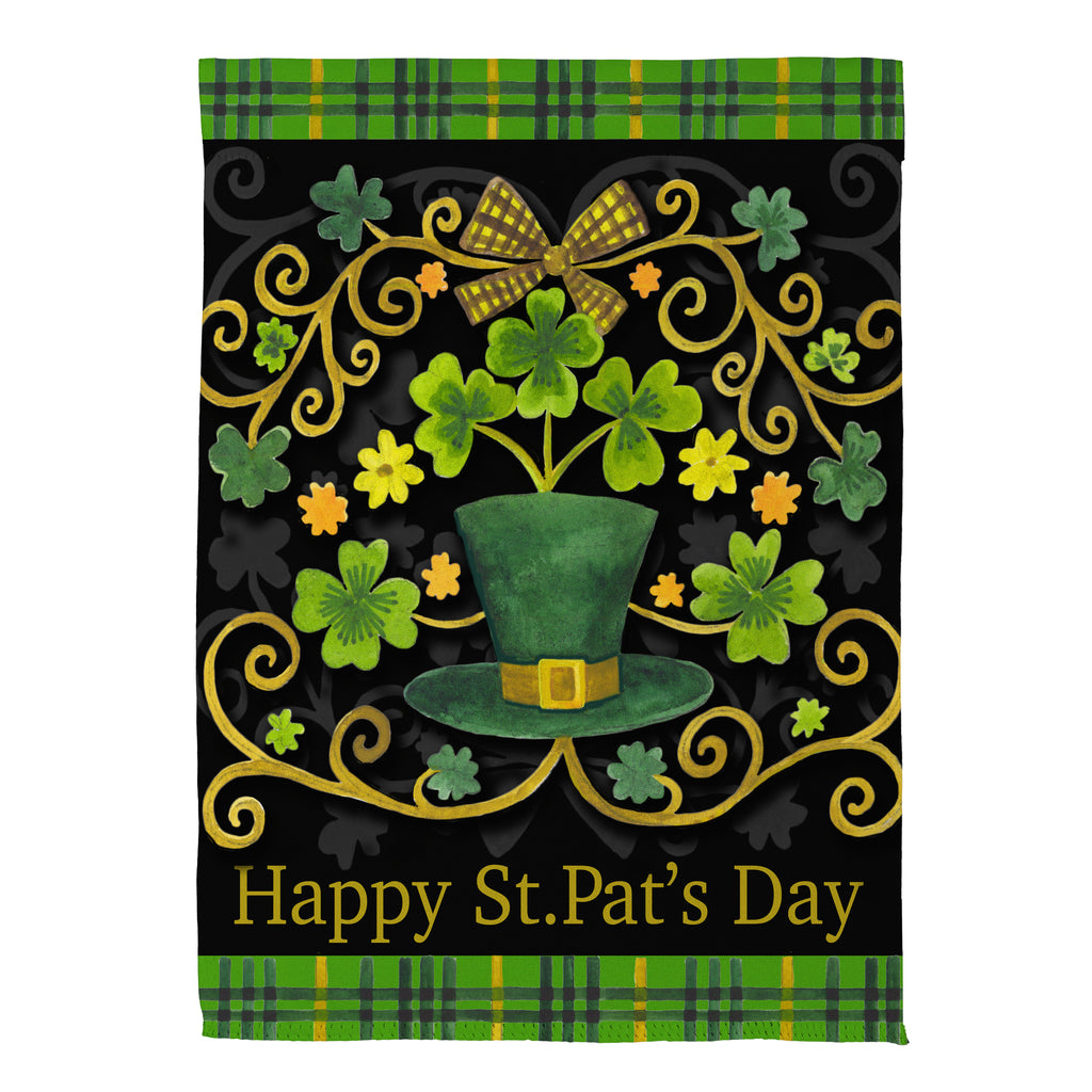 Celebrate St. Patrick's Day with this ornate suede garden flag, featuring a festive design of shamrocks, a leprechaun hat, and decorative swirls. Perfect for adding a touch of Irish charm to your outdoor space.