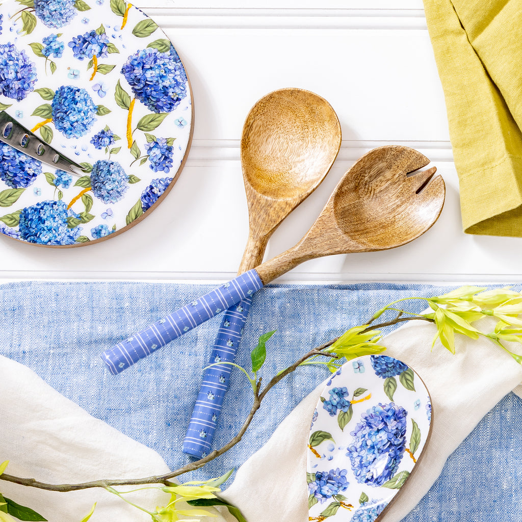 Enhance your dining experience with the VivaStyle Wood Salad Server set, featuring a charming hydrangea pattern on the handles. Perfect for spring gatherings, these utensils combine functionality with aesthetic appeal.
