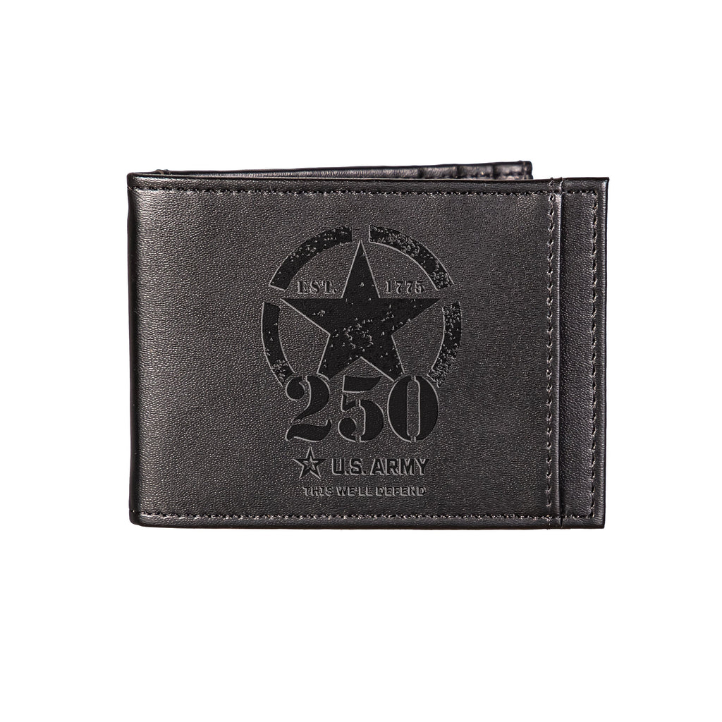 Celebrate the 250th Anniversary of the US Army with this sleek front pocket wallet featuring RFID blocking technology. The wallet is designed in a classic black color and showcases a commemorative design.