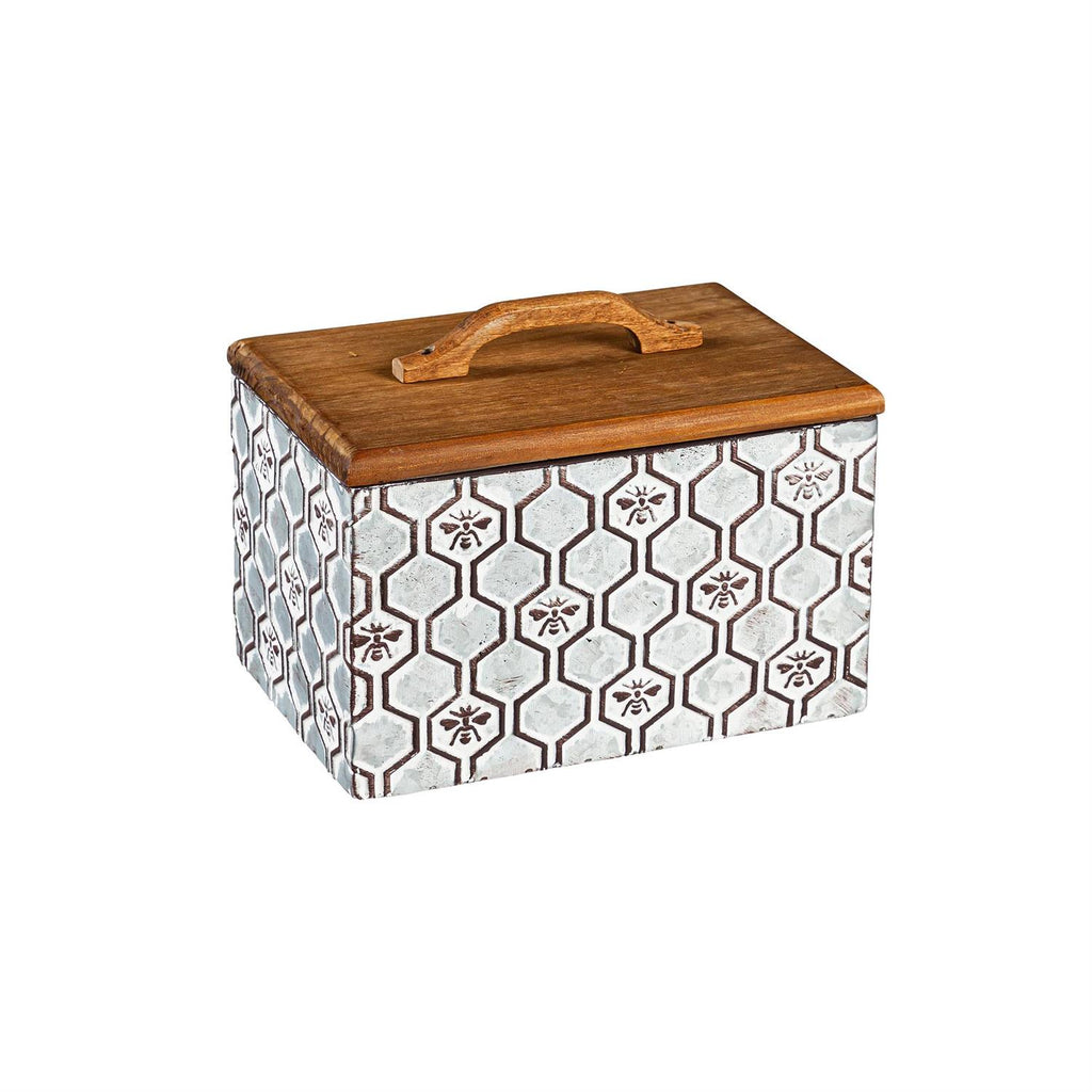 Enhance your storage solutions with this charming Pollinator Garden Storage set. Crafted from metal with an embossed bee and honeycomb design, these boxes add a touch of rustic elegance to any space. The wooden lids feature sturdy handles, making them easy to access and perfect for keeping your items secure. Ideal for organizing seeds, tools, or any small garden essentials, this nested set of two offers versatility and style. With dimensions of 10.25 inches in length, 7.5 inches in width, and 8 inches in height, they fit effortlessly into your home or garden setting.
